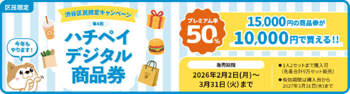 渋谷区のキャッシュレス決済アプリ『ハチペイ』は通常どなたでも使用できますが、今回は渋谷区在住の方限定でデジタル商品券が発売されます。